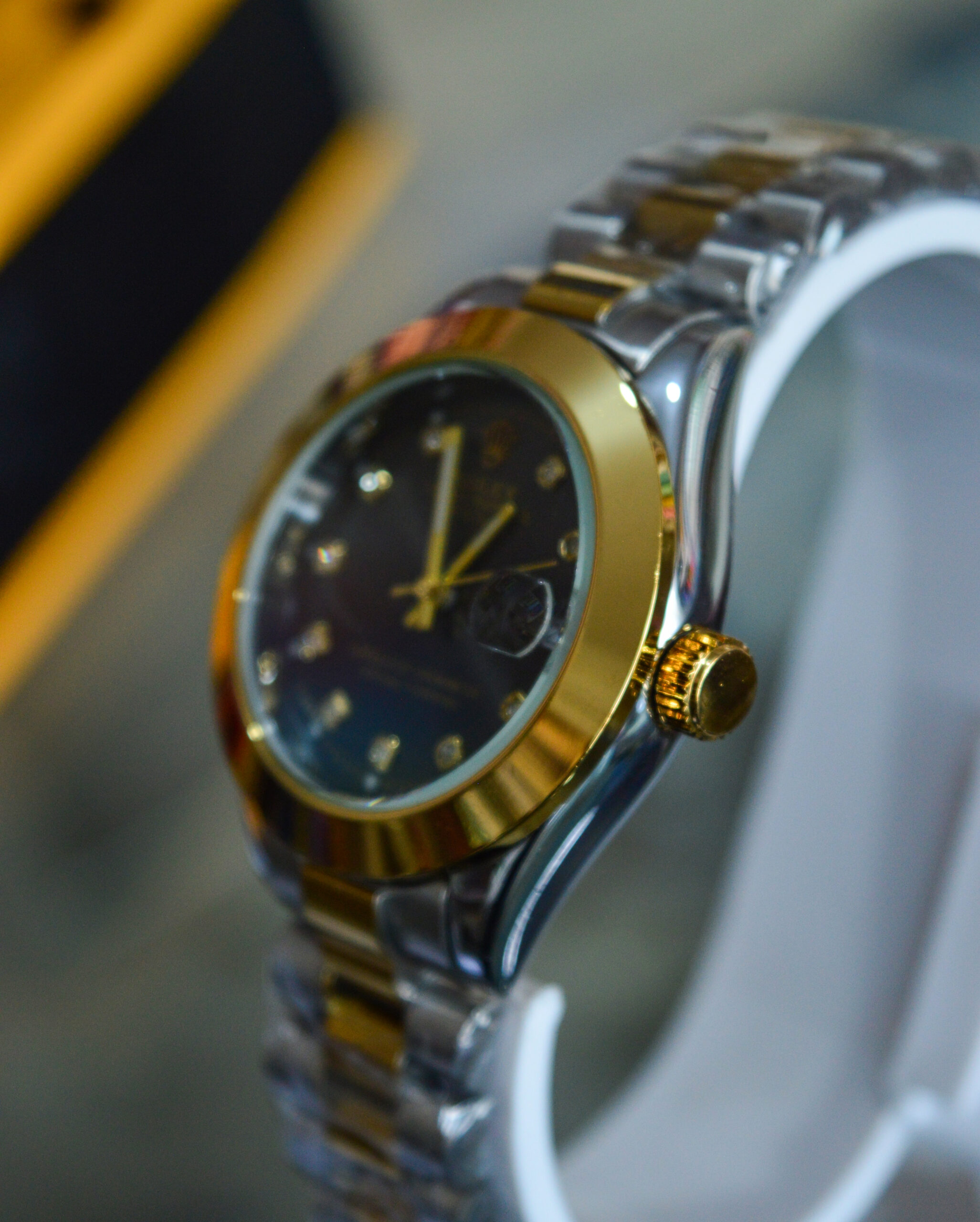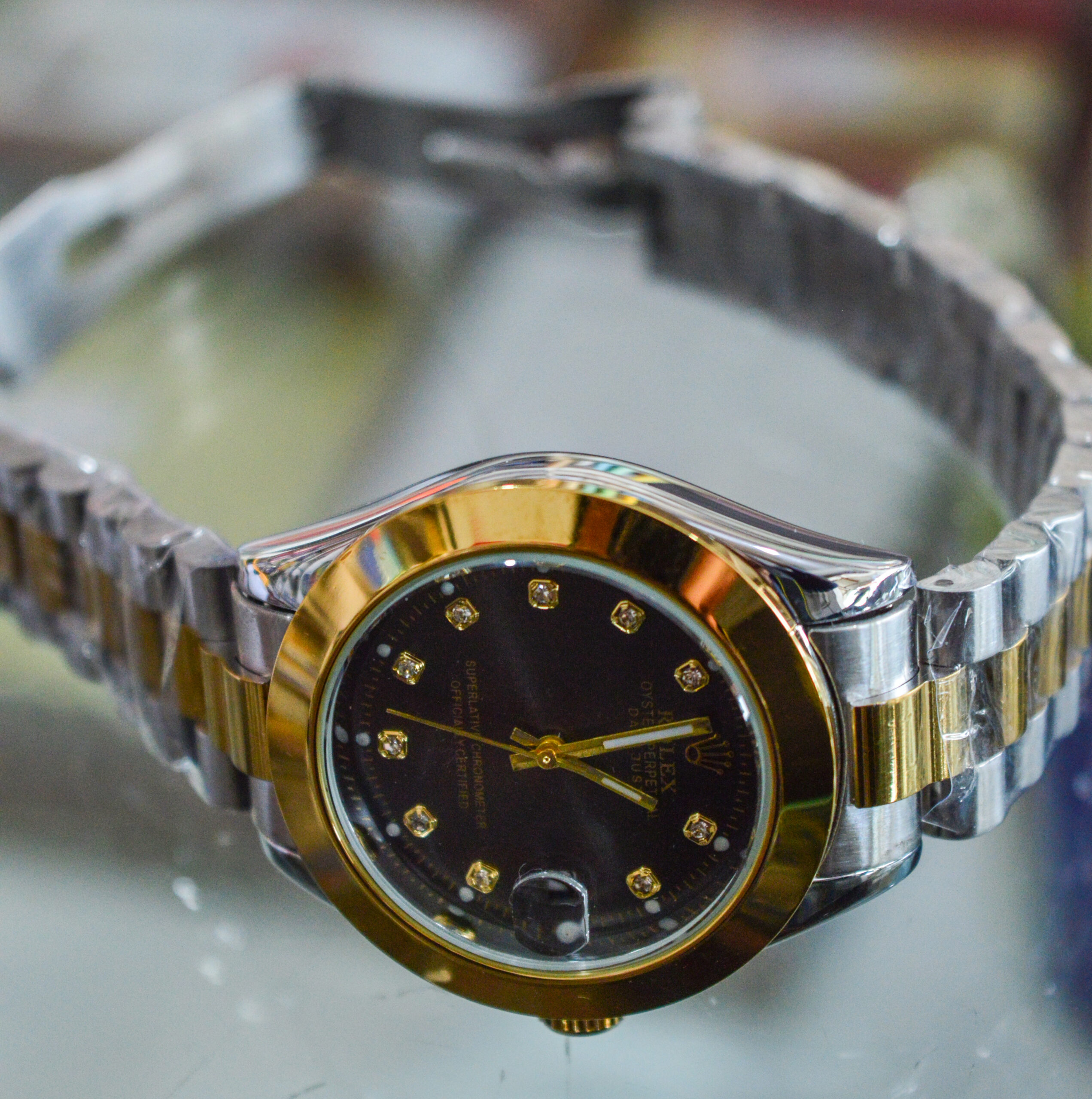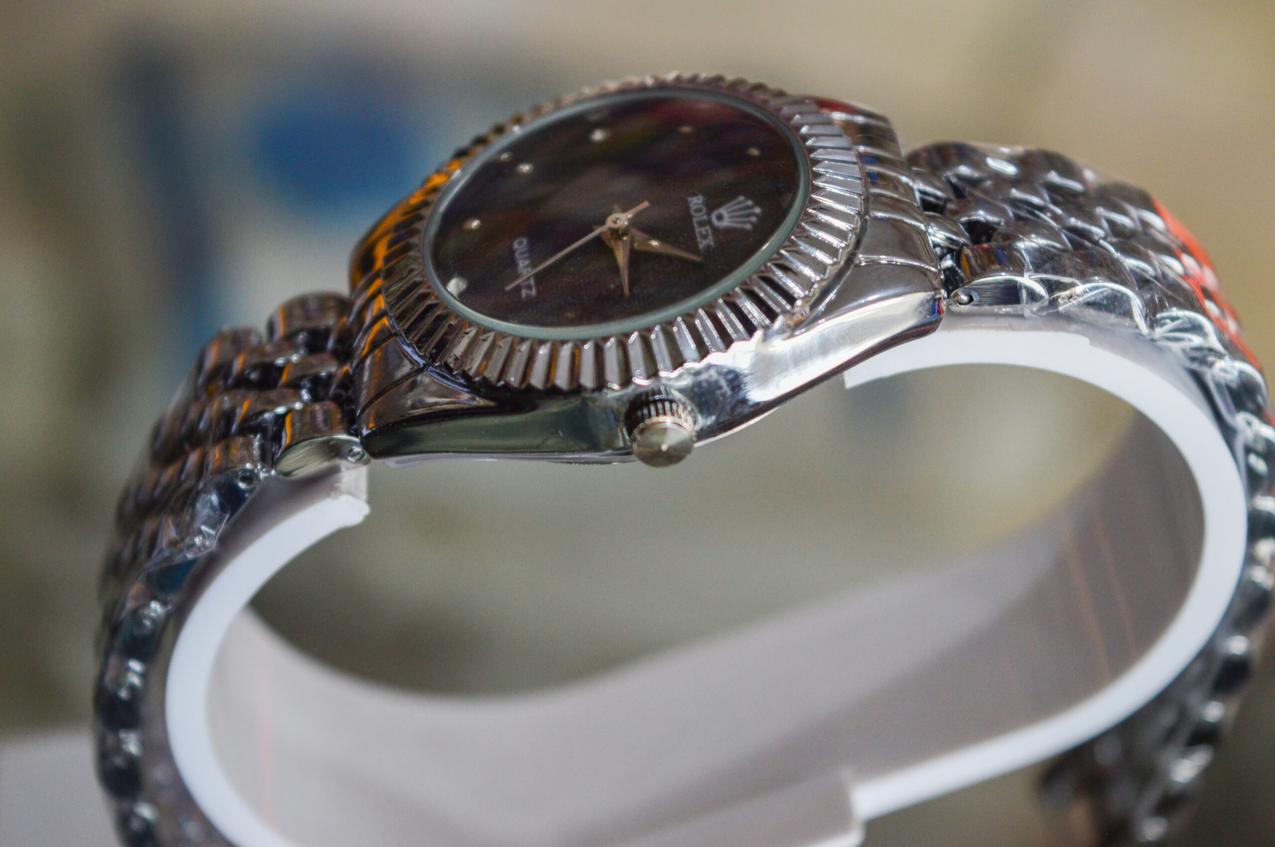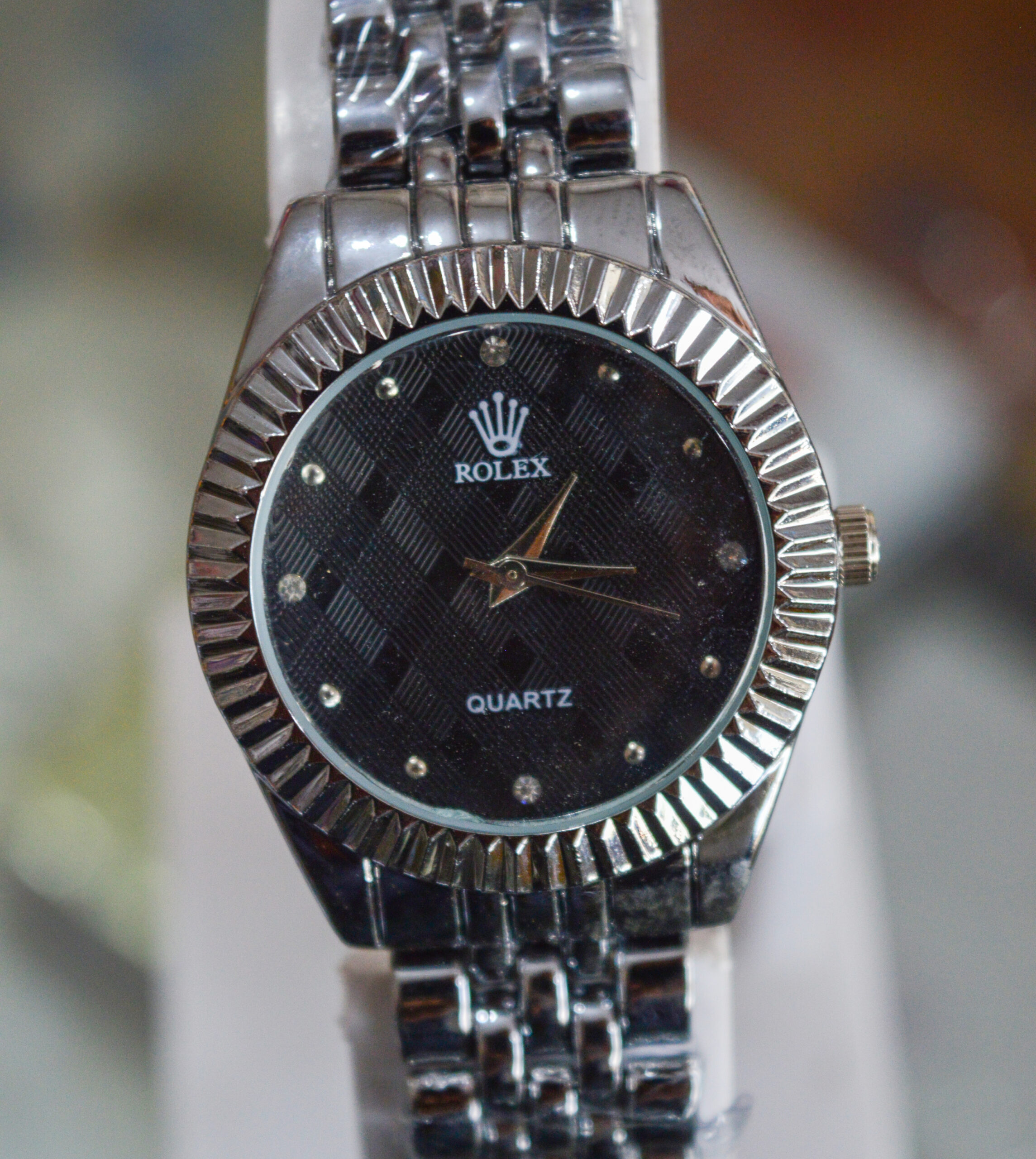 - Branding & Movement: The dial features a crown logo and “ROLEX” above the center and the word “QUARTZ” below the center, indicating a battery-powered movement.