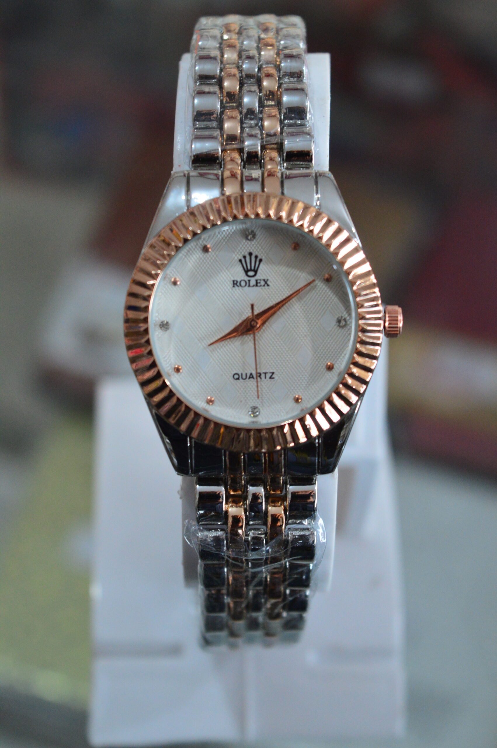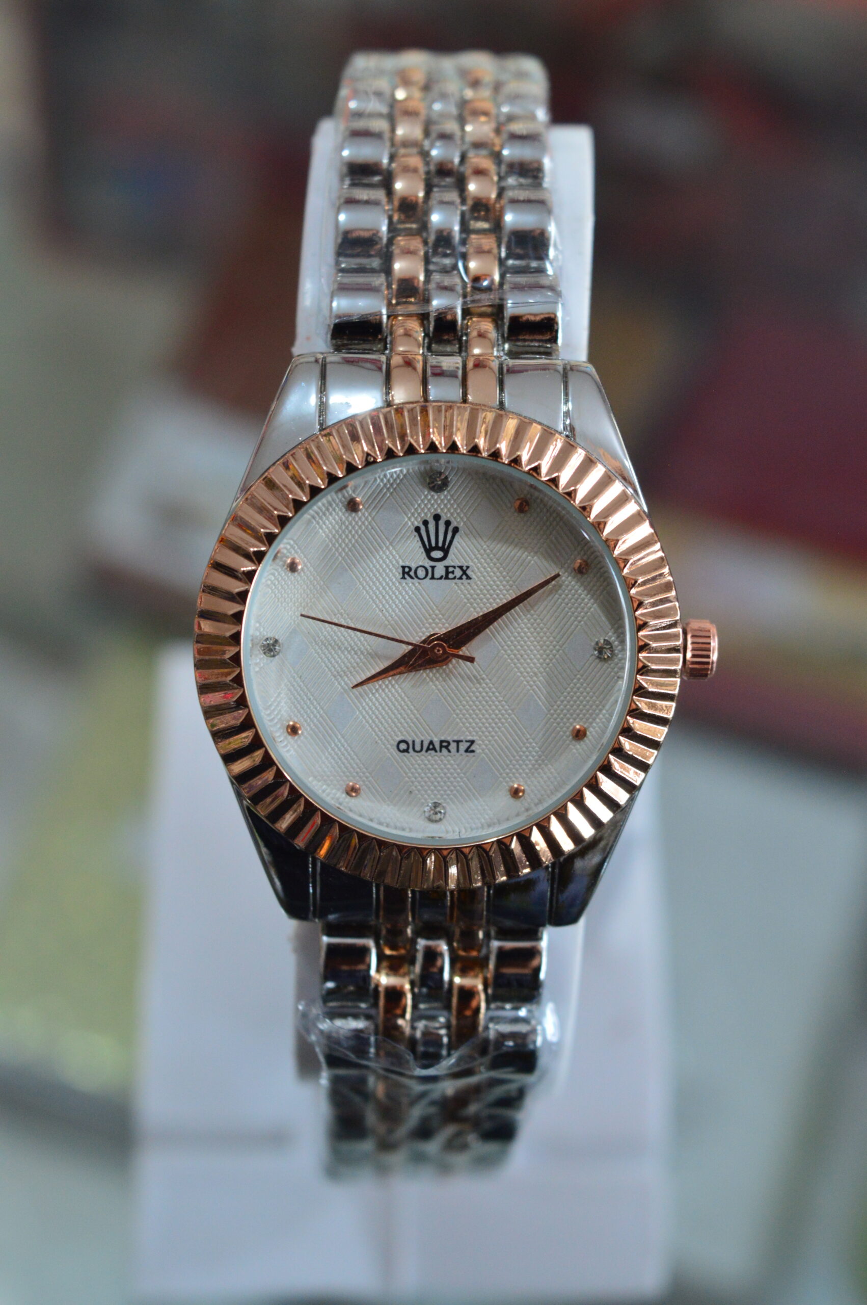 - Movement: Indicated as a “QUARTZ” movement on the dial, meaning it is battery-powered, which is uncharacteristic for genuine Rolex watches, most of which are automatic or mechanical.